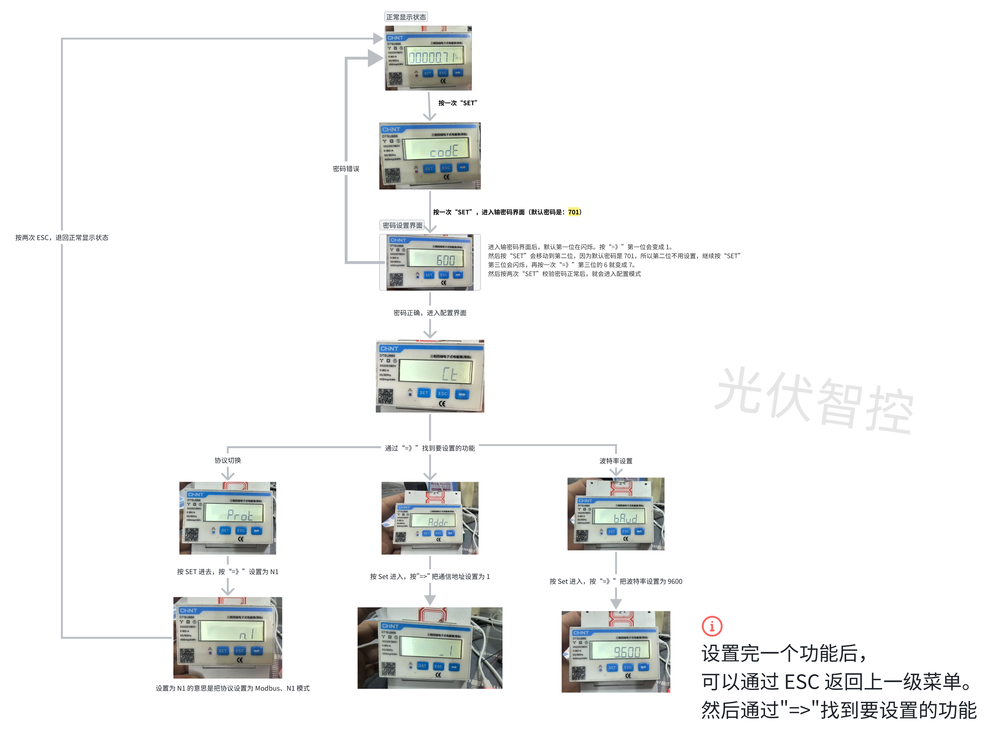 如果电表的通信协议不是“Modbus、8N1、通信地址01、波特率9600”,可以参考以下的流程图。